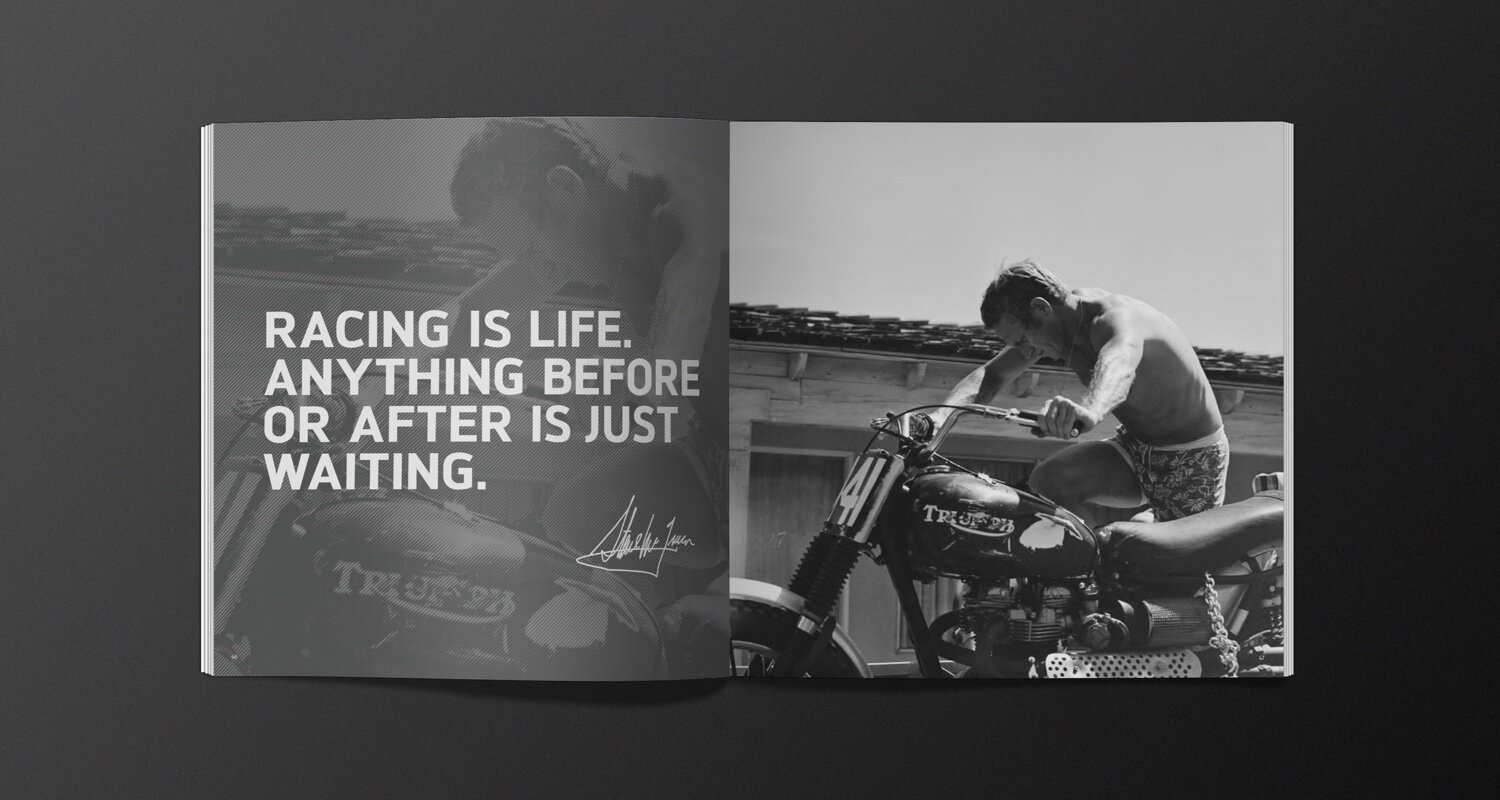 To ensure our concepts were going to both inspire and resonate with the Triumph audience, we immediately immersed ourselves in the world of motorcycles. This included talking to the target market, conducting extensive research, taking a behind-the-scenes tour of the product development facility, and being involved in photo shoots for the clothing brochure.